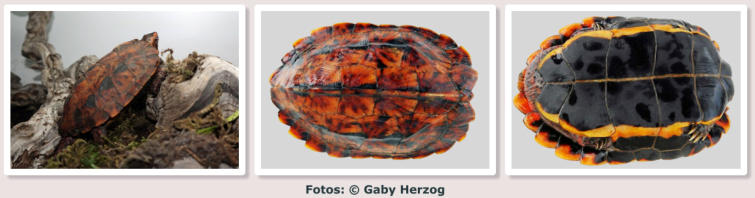 | Erkennungsmerkmale | dreikieliger, länglicher und gelbbrauner Carapax mit gesägtem Hinterrand; Plastron dunkelbraun bis schwarz mit gelbem Rand; hakenförmiger Schnabel |